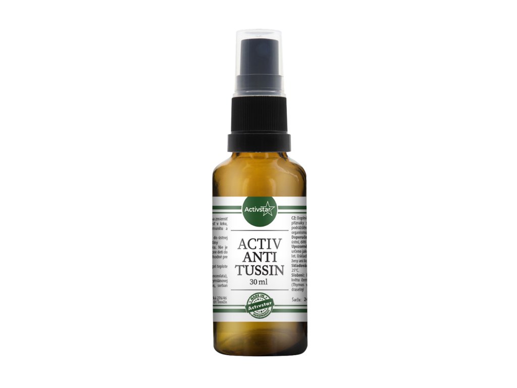 ACTIV ANTI TUSSIN je doplněk stravy ve formě sublingválního spreje. Obsahuje kombinaci rostlinných extraktů, včetně aceroly jako přírodního zdroje vitaminu C, a vybraných bylinných složek. Produkt je určen jako součást běžného denního režimu pro dospělé i děti od 3 let.