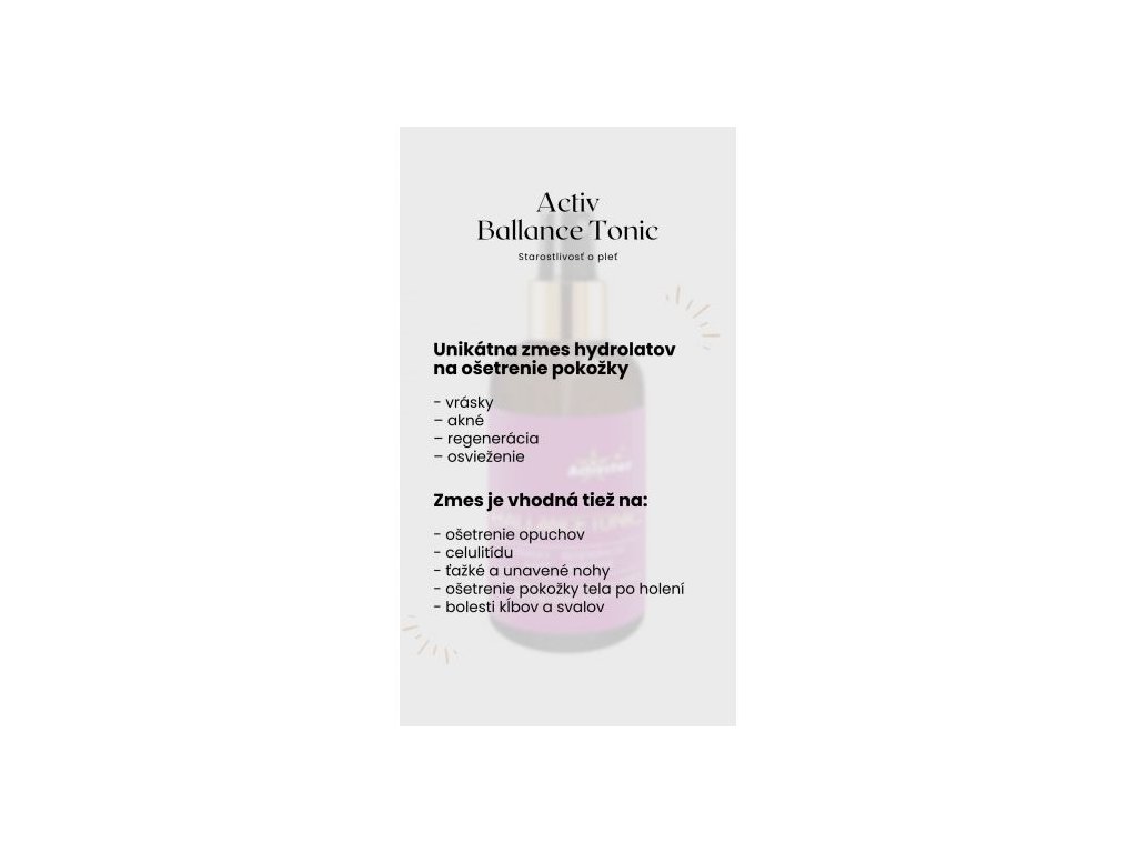 ACTIV BALLANCE TONIC je kosmetický přípravek určený k péči o pokožku. Obsahuje směs 100% bio hydrolátů z levandule lékařské, yzopu lékařského a šalvěje lékařské. Produkt je určen k vnějšímu použití a lze jej používat jako součást každodenní kosmetické rutiny.
